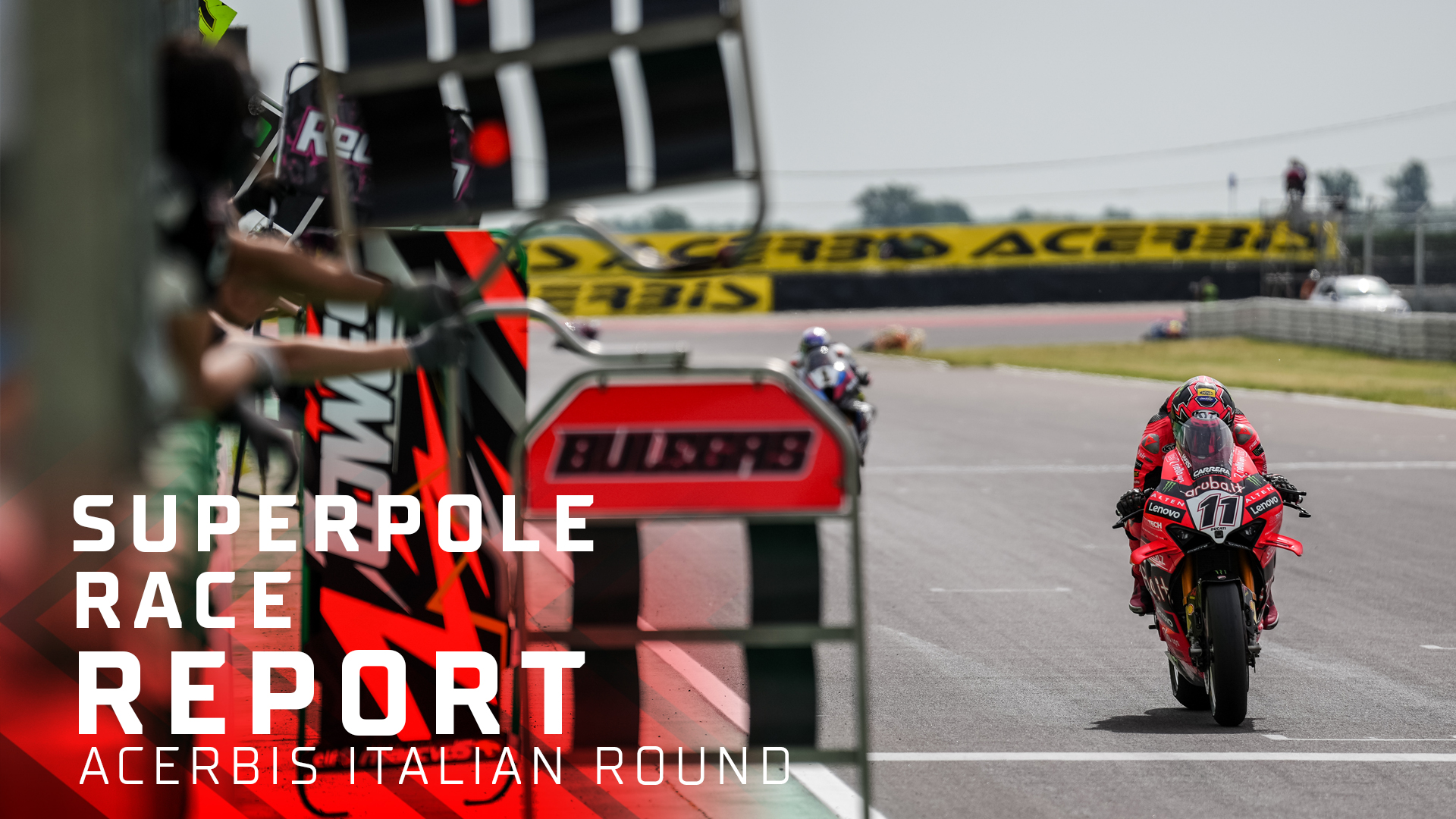 La jornada dominical del Campeonato del Mundo MOTUL FIM Superbike ha comenzado en Cremona con la Tissot Superpole Race, la primera carrera del día. Nicolo Bulega (Aruba.it Racing – Ducati) ha sumado su segunda victoria del fin de semana en su casa, escapándose de Toprak Razgatlioglu (ROKiT BMW Motorrad WorldSBK Team), segundo, y de su compañero Álvaro Bautista (Aruba.it Racing – Ducati), que ha cruzado la meta en tercera posición. La victoria de Bulega - su 12ª con Ducati en WorldSBK - le hace igualar a Scott Redding (MGM BONOVO Racing), colocándole a sólo una de Giancarlo Falappa y Frankie Chilli con 13, los pilotos italianos de Ducati con más éxitos en WorldSBK.